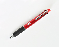 エンジ色のボディに校友会のロゴが付いた多機能ペン。0.5ミリの黒、赤、青、緑の4色に0.5ミリのシャープペンシルも付いています。替え芯は油性で、とても滑らかな書き心地のジェットストリームです。校友必携です。