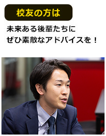 現役学生、若手校友の皆さま、それぞれにとって、同じ「ワセダ」出身の先輩・後輩と交流できる貴重な機会です。現役学生は、社会で活躍されている若手校友の皆さまとお話できる機会を心待ちにしています。